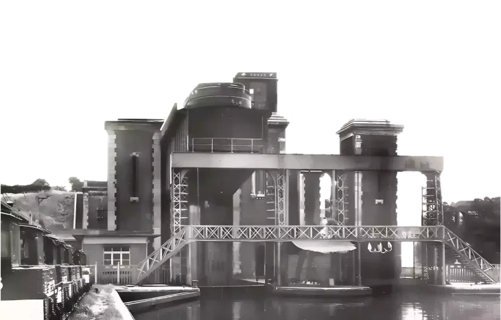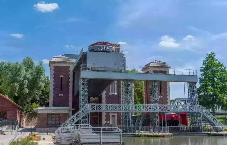 Conçu pour les péniches de type Freycinet, l’ascenseur à bateaux était une véritable révolution technologique lors de son inauguration en 1888. Grâce à un ingénieux système hydraulique en équilibre, deux bacs remplis d’eau se croisent : lorsque l’un monte, l’autre descend, accélérant ainsi considérablement le transport fluvial.